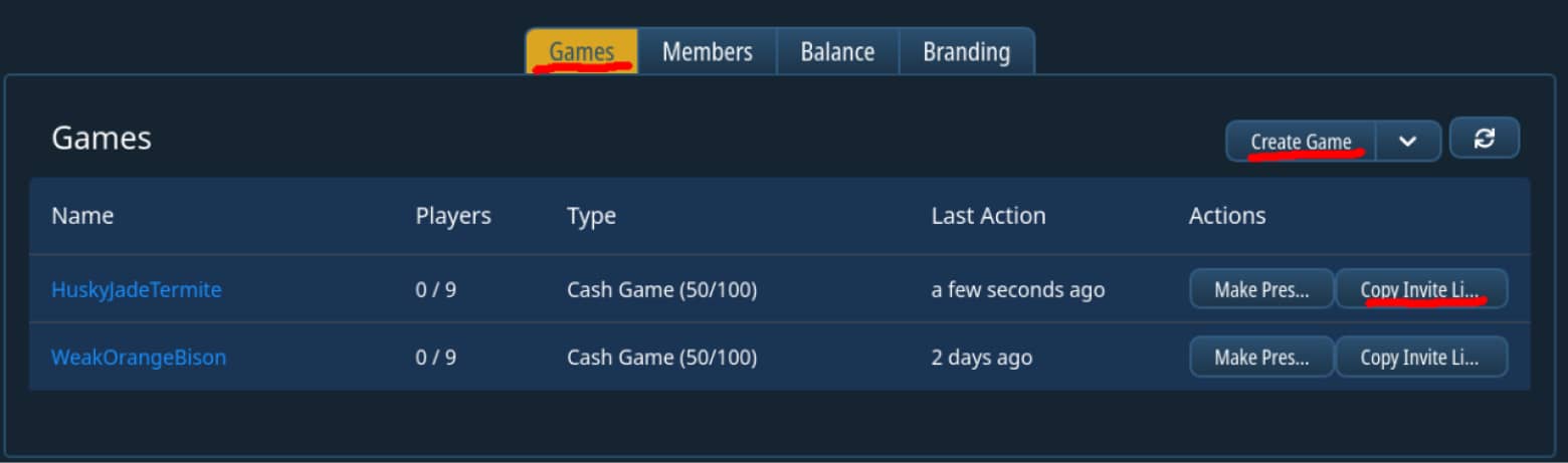 - send that link to every other player. When they follow the link they will be able to join your club and take a seat at the table.