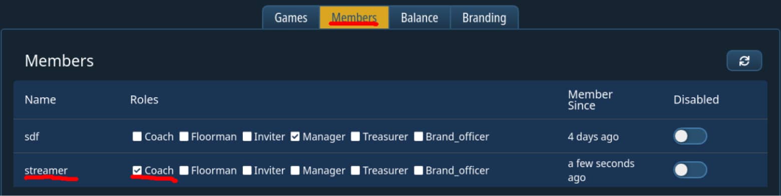 - assign the second user the coach role in the “members” page of the club